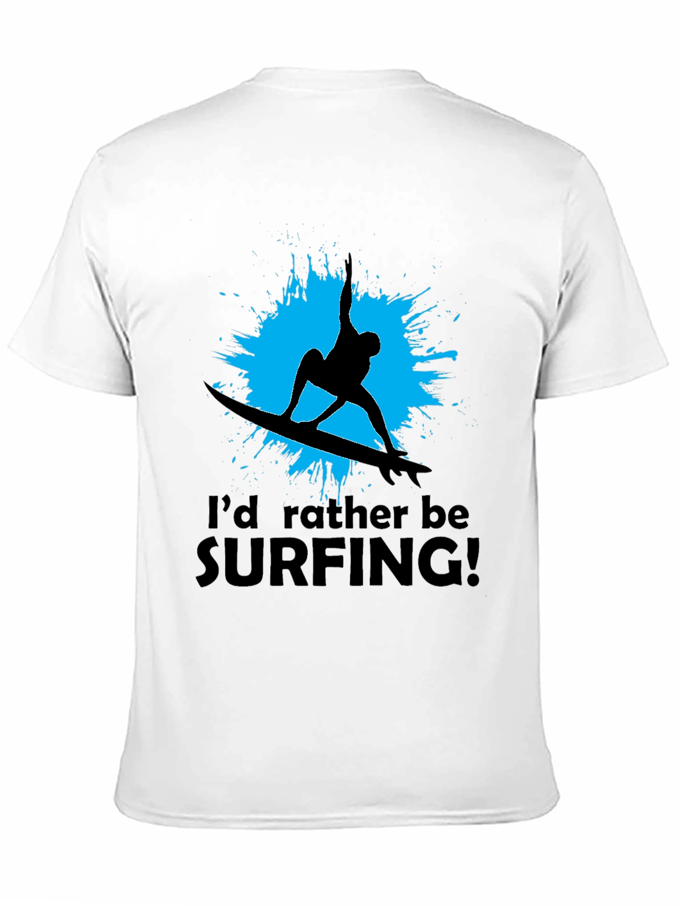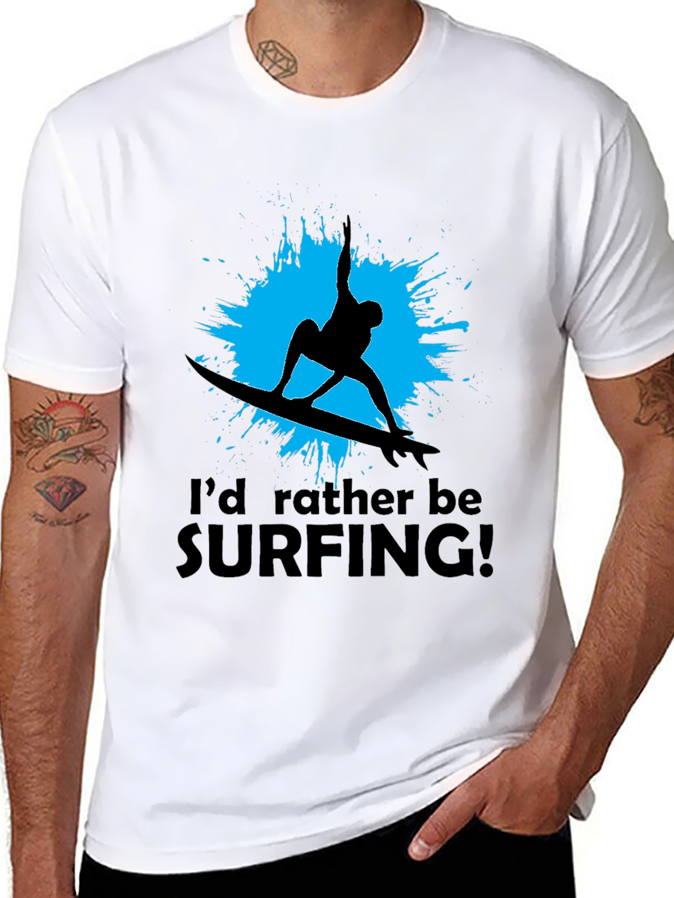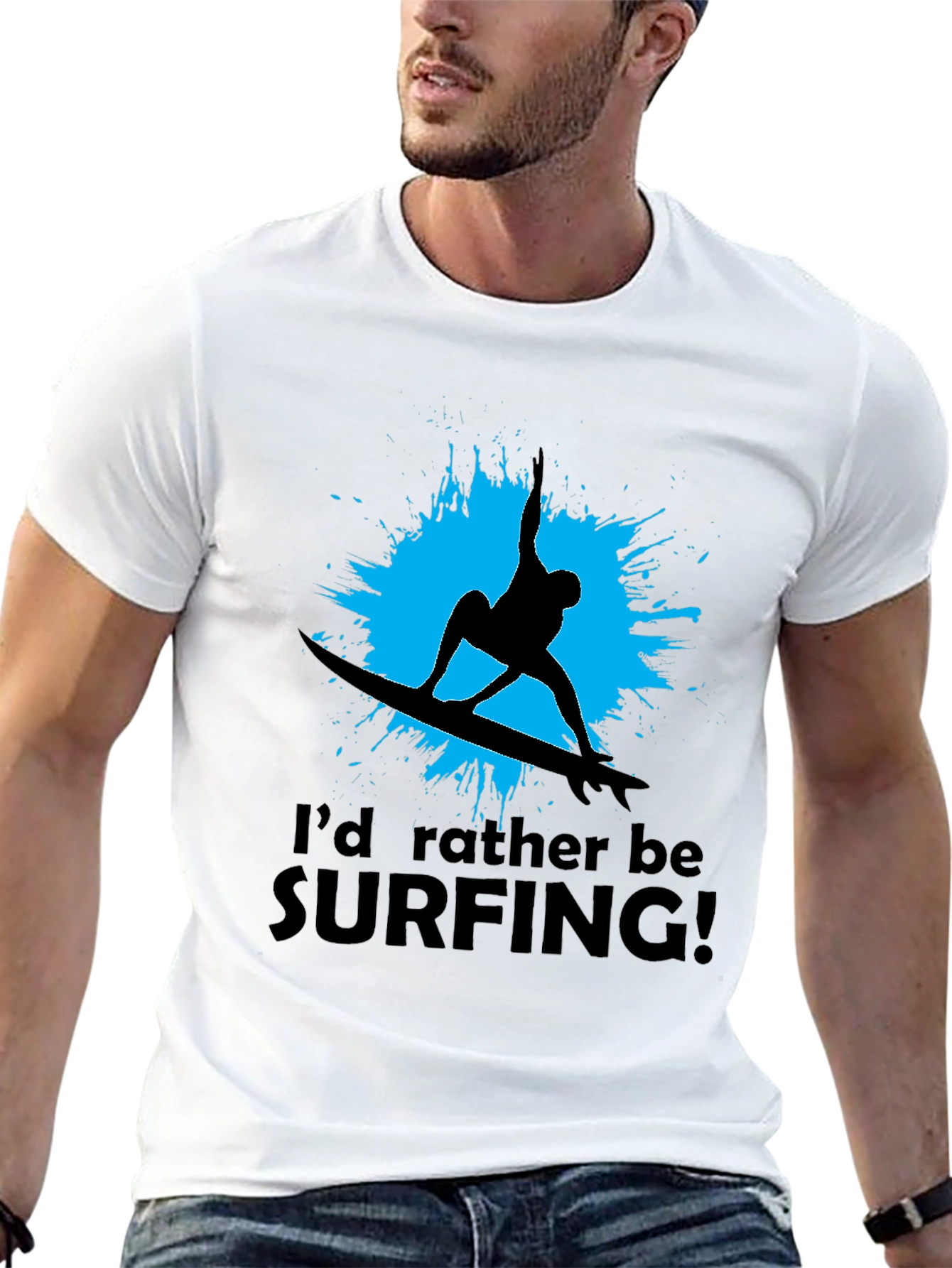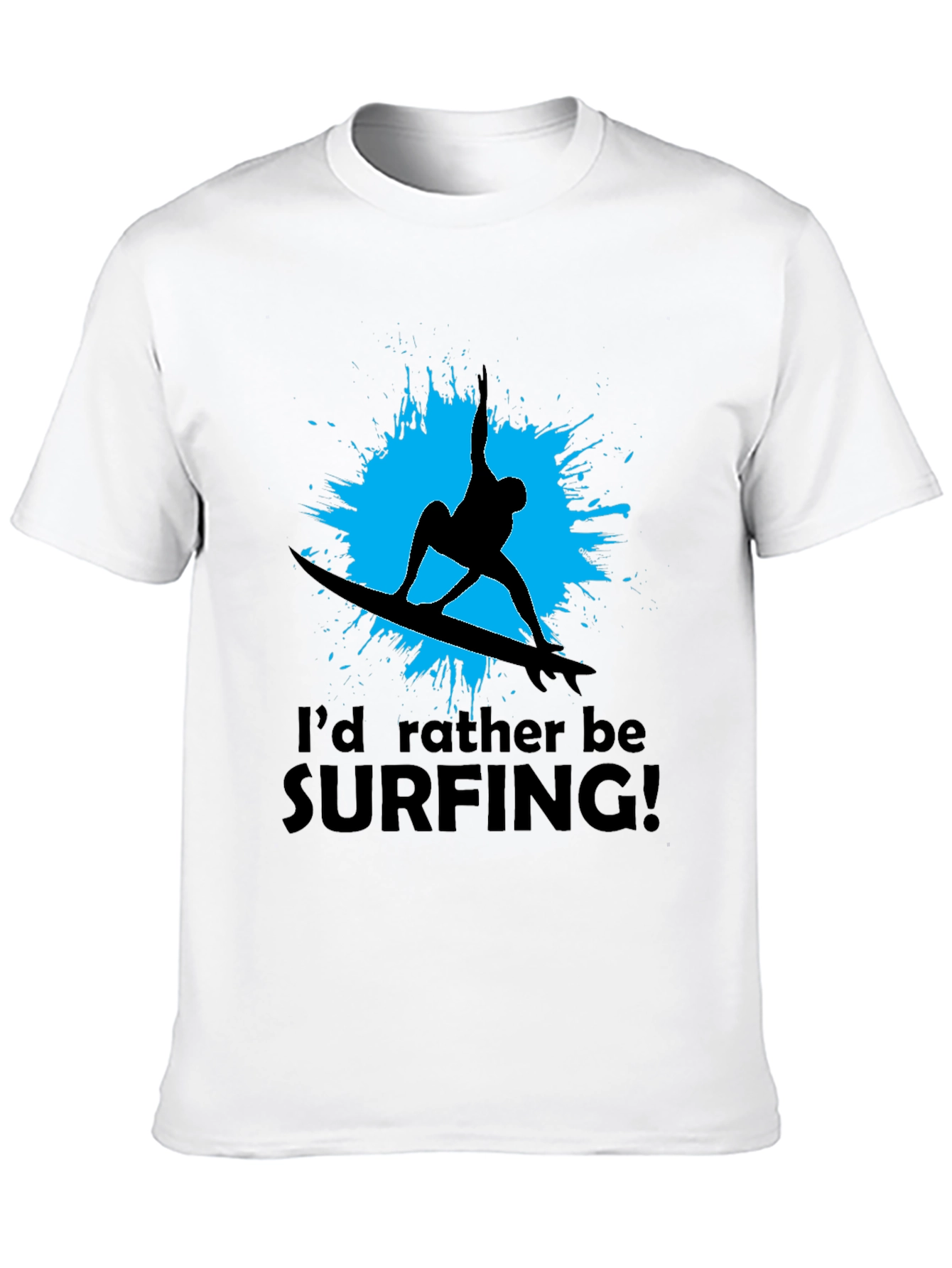 Catch the wave with this cool black t-shirt featuring a surfer silhouette against a vibrant blue splash design. The bold statement "I'd rather be SURFING!" captures the spirit of adventure and love for the ocean. Made from comfortable fabric, this tee is perfect for casual outings, beach days, or simply expressing your passion for surfing. The eye-catching graphic print adds a unique touch, making it a great conversation starter. Ideal for surfers, beach lovers, and anyone who enjoys a relaxed, stylish look. Get yours today and let everyone know where you'd rather be!