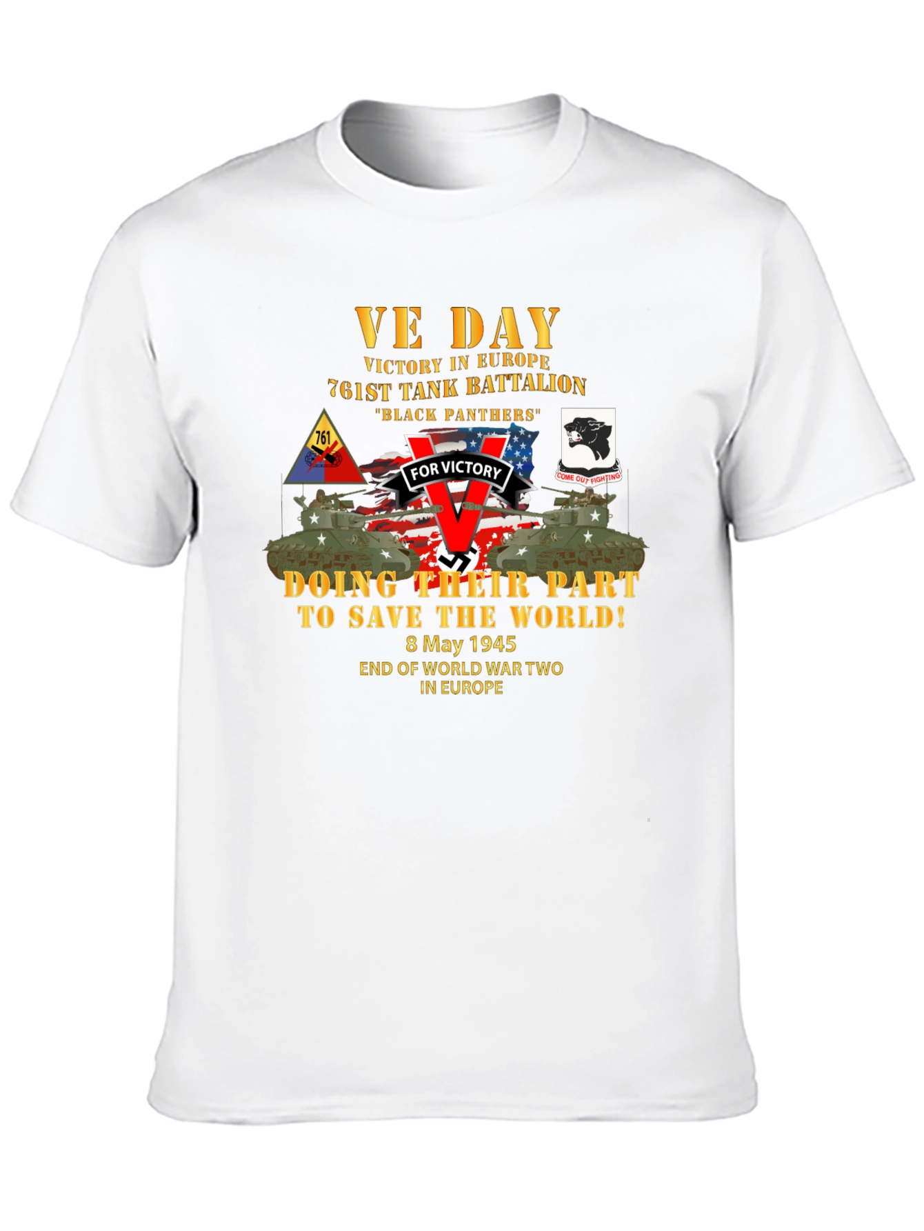Show your appreciation for the heroes of the 761st Tank Battalion with this striking black t-shirt. Featuring a bold design commemorating VE Day and the victory in Europe, this shirt pays tribute to the "Black Panthers" and their contribution to saving the world during World War Two. The design incorporates the 761st insignia, American flags, and powerful imagery. Made from comfortable and durable materials, this t-shirt is perfect for history enthusiasts, veterans, and anyone who wants to honor the sacrifices made during the war. Wear it proudly to commemorate 8 May 1945, the end of World War Two in Europe.