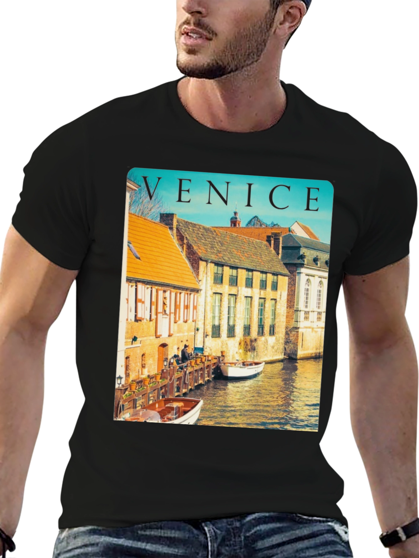 Show your love for Venice with this classic cityscape graphic tee. The black t-shirt features a vibrant, high-quality print of Venice's picturesque canals, historic buildings, and charming boats. Made from a soft, comfortable fabric, this tee is perfect for everyday wear or as a souvenir from your travels. The design captures the essence of Venice, making it a stylish and unique addition to your wardrobe. Wear it casually with jeans, shorts, or pair it with a jacket for a trendy look. A great way to express your passion for travel and iconic cities. Makes a wonderful gift for travel lovers!