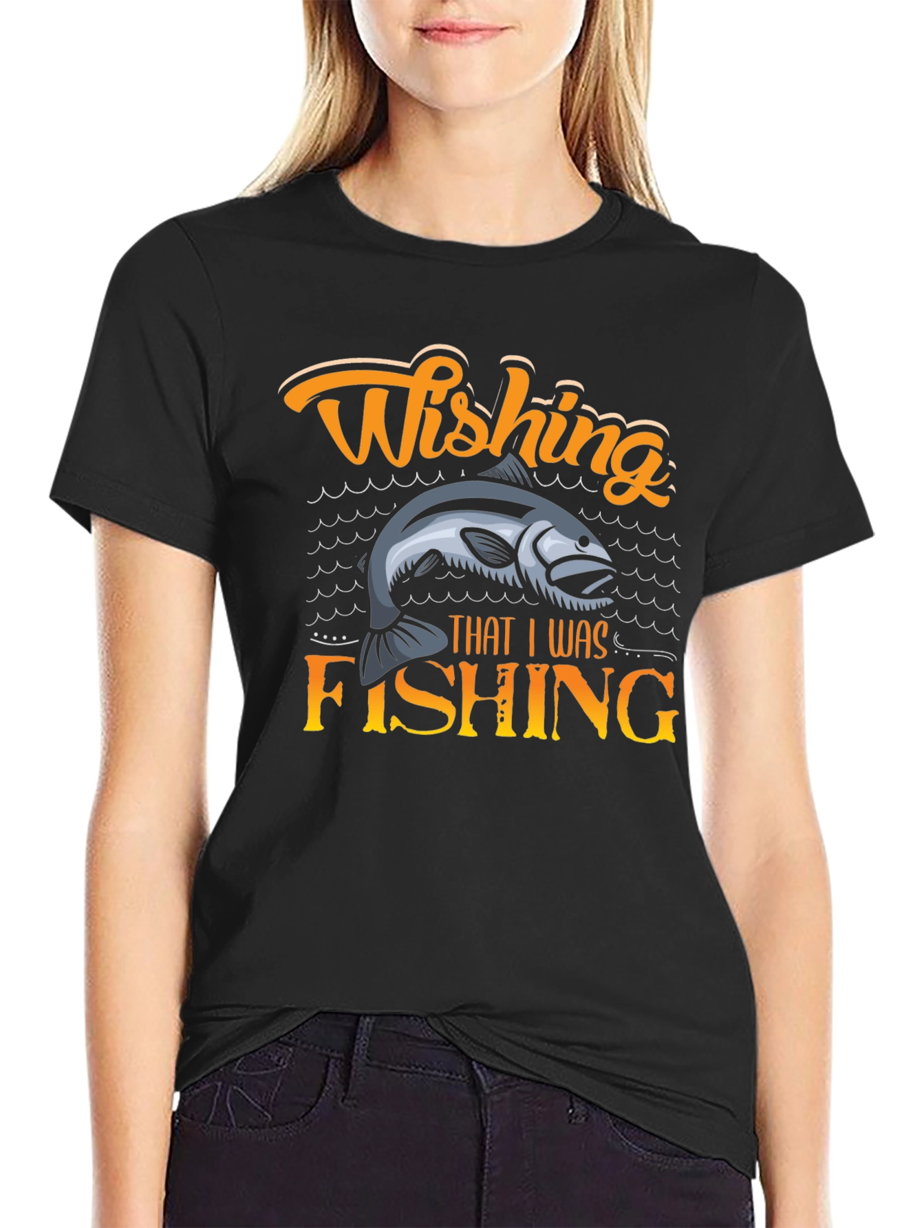 Showcase your love for fishing with this stylish black t-shirt. The shirt features a vibrant graphic of a fish jumping above the water. The words "Wishing That I Was Fishing" are printed in bold, eye-catching letters, making it a perfect conversation starter for fellow anglers. Made from comfortable materials, this t-shirt is ideal for casual wear, fishing trips, or outdoor adventures. Great as a gift for the fishing enthusiast in your life or as a fun addition to your wardrobe.