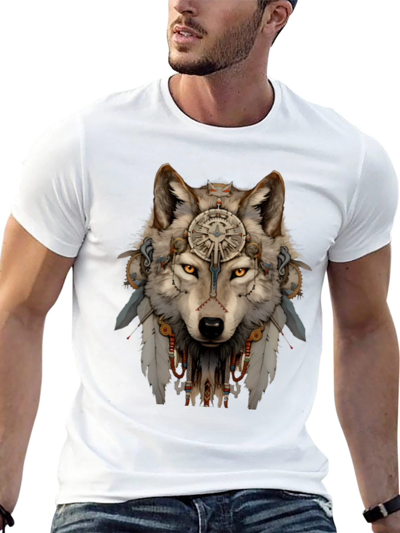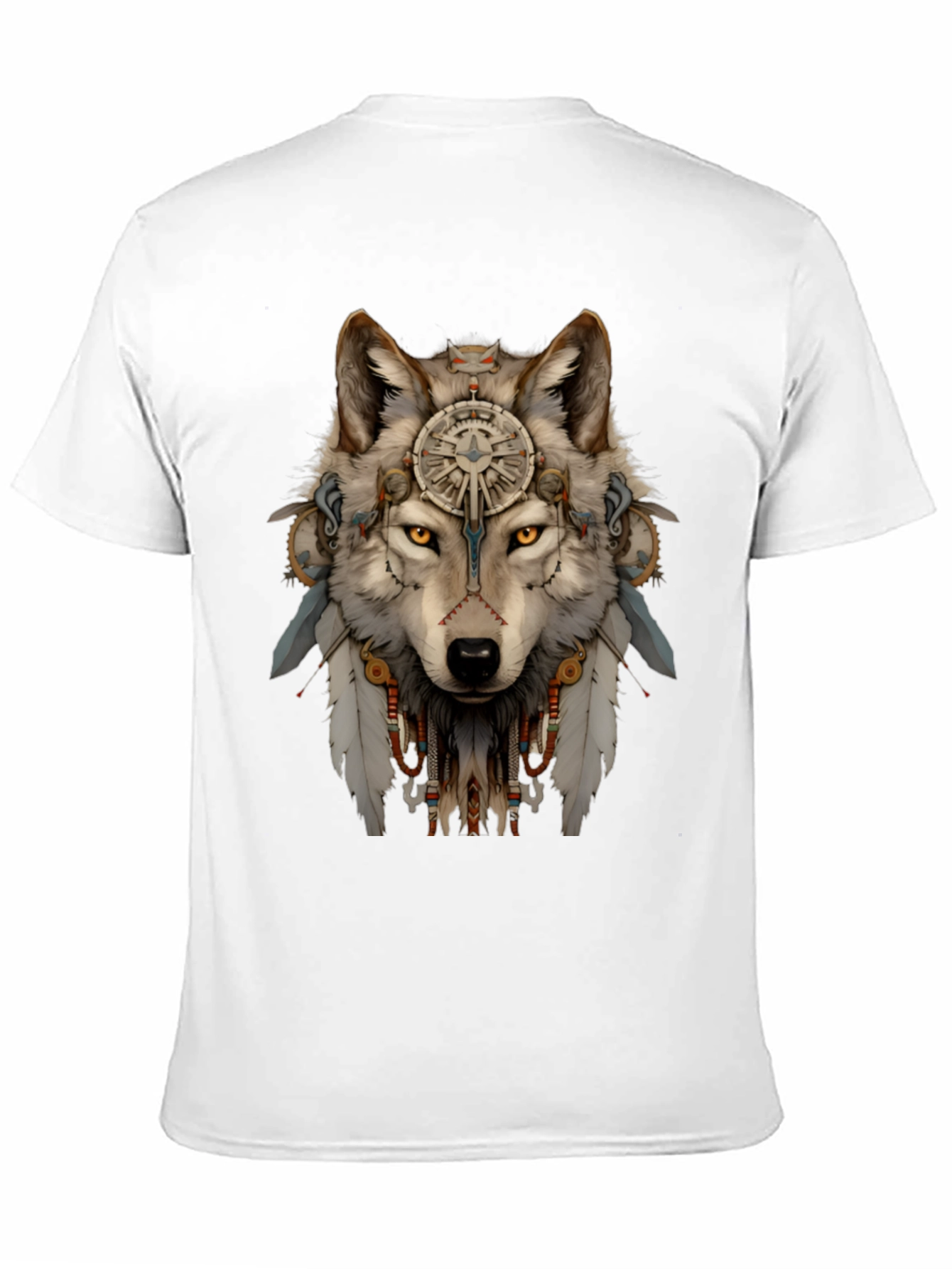 Embrace your inner spirit with this unique wolf t-shirt. The striking graphic features a detailed wolf head adorned with tribal elements, feathers, and intricate ornaments. The design is printed on a soft, comfortable black tee. Perfect for casual wear, outdoor adventures, or expressing your individual style, this shirt is sure to turn heads. Show off your wild side with this eye-catching and comfortable tee, a must-have addition to any wardrobe. Great for everyday wear or as a gift for wolf and nature lovers. Order yours today and unleash your inner wolf!