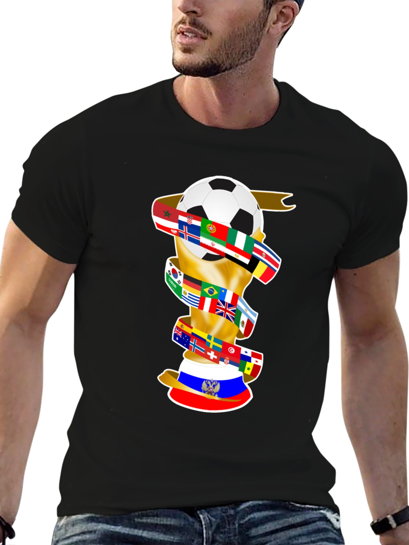 Show your love for the beautiful game with this unique World Cup Flags Football T-Shirt! Featuring a vibrant design of a football surrounded by flags from participating countries, this tee is perfect for any soccer fan. The eye-catching graphic is printed on a comfortable, breathable fabric, making it ideal for casual wear, watching matches, or even playing a pick-up game. Stand out from the crowd and celebrate the spirit of international football with this must-have shirt. It's more than just a t-shirt, it's a statement of your passion for the World Cup and the global community it brings together. Get yours today and be ready for the next big tournament!