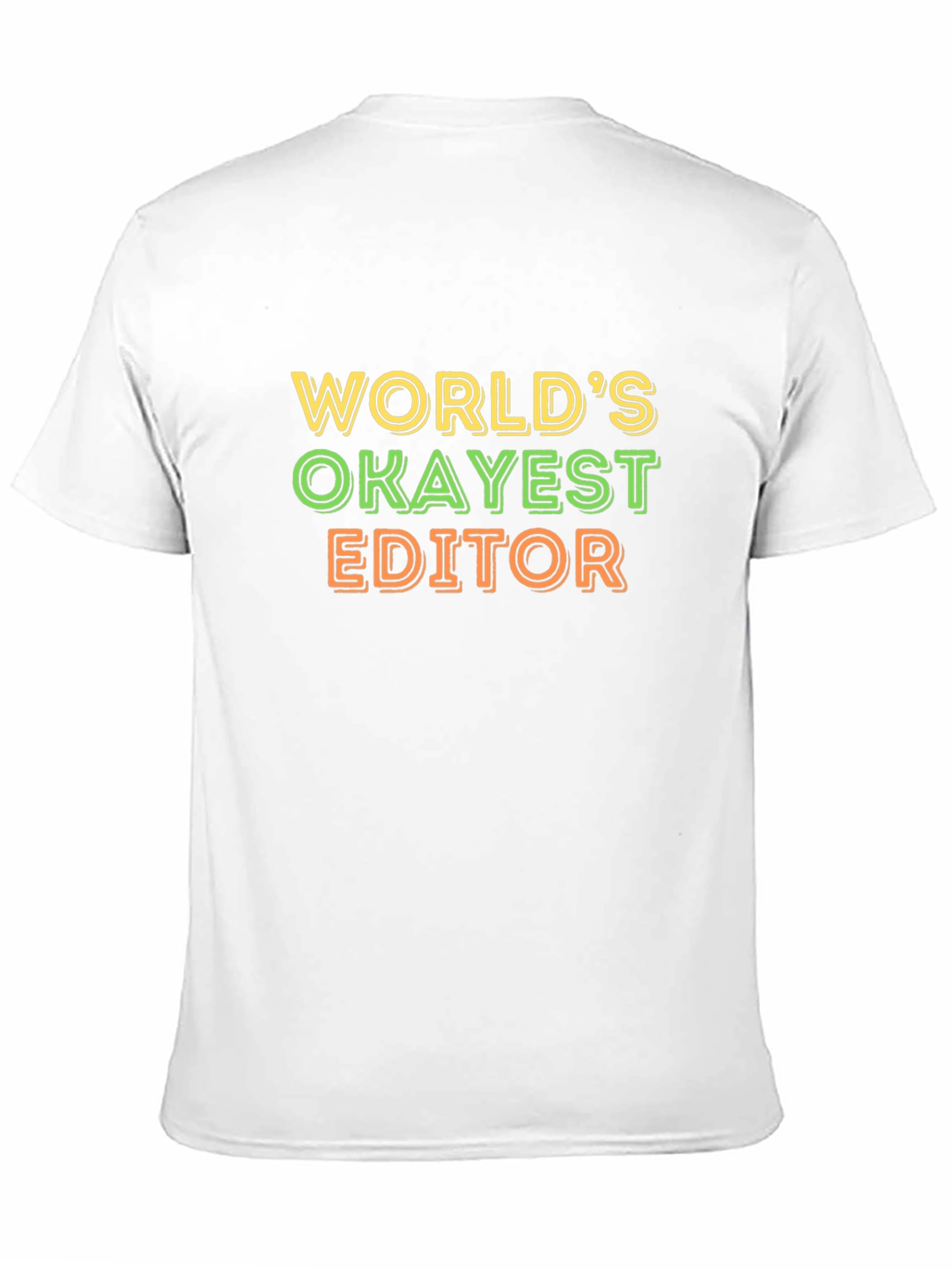 Show off your self-deprecating humor with this World's Okayest Editor T-shirt. This classic tee features a bold, eye-catching design with the phrase "World's Okayest Editor" printed in stacked, retro-inspired fonts. The text is colored in layers of yellow, green, and orange. Made from soft, breathable fabric, this T-shirt offers all-day comfort. Its versatile style makes it perfect for casual outings, work, or relaxed evenings at home. Makes a fun and relatable gift for the editor in your life who appreciates a good laugh! Available in a standard fit.