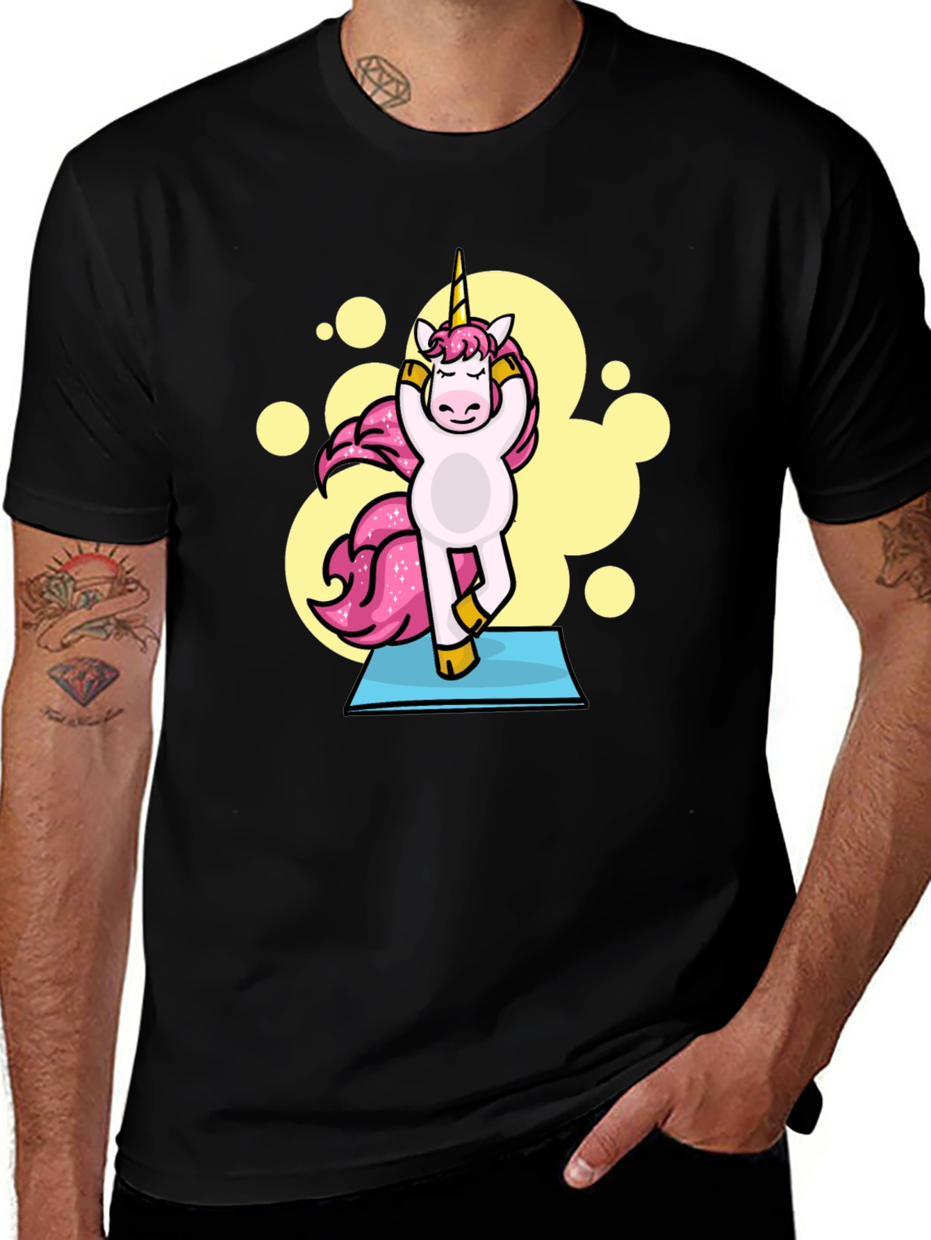Strike a pose in this fun and quirky black t-shirt featuring a cute yoga unicorn graphic. This playful design showcases a cartoon unicorn in a yoga pose on a yoga mat, surrounded by a whimsical yellow backdrop. Made from a comfortable-looking fabric, this tee is perfect for everyday wear, yoga sessions, or as a fun gift for unicorn lovers. Show off your love for yoga and unicorns with this unique and eye-catching shirt!