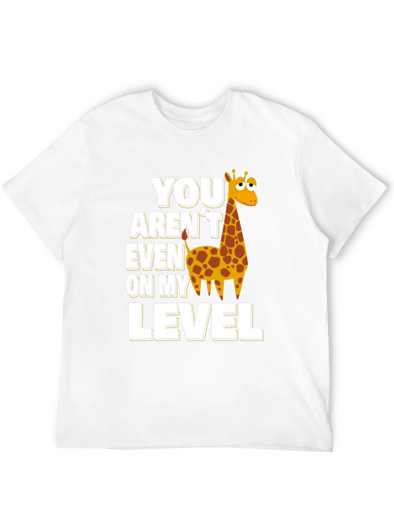Show off your sense of humor with this stylish black t-shirt. The shirt features the phrase "You Aren't Even On My Level" in bold, eye-catching white and yellow lettering. A cute cartoon giraffe is incorporated into the design. This tee is perfect for casual wear. The comfortable fit makes it ideal for everyday activities or lounging around. Made from what appears to be a soft, breathable fabric, this shirt will keep you feeling cool and confident all day long. This tee is sure to turn heads and spark conversations wherever you go.