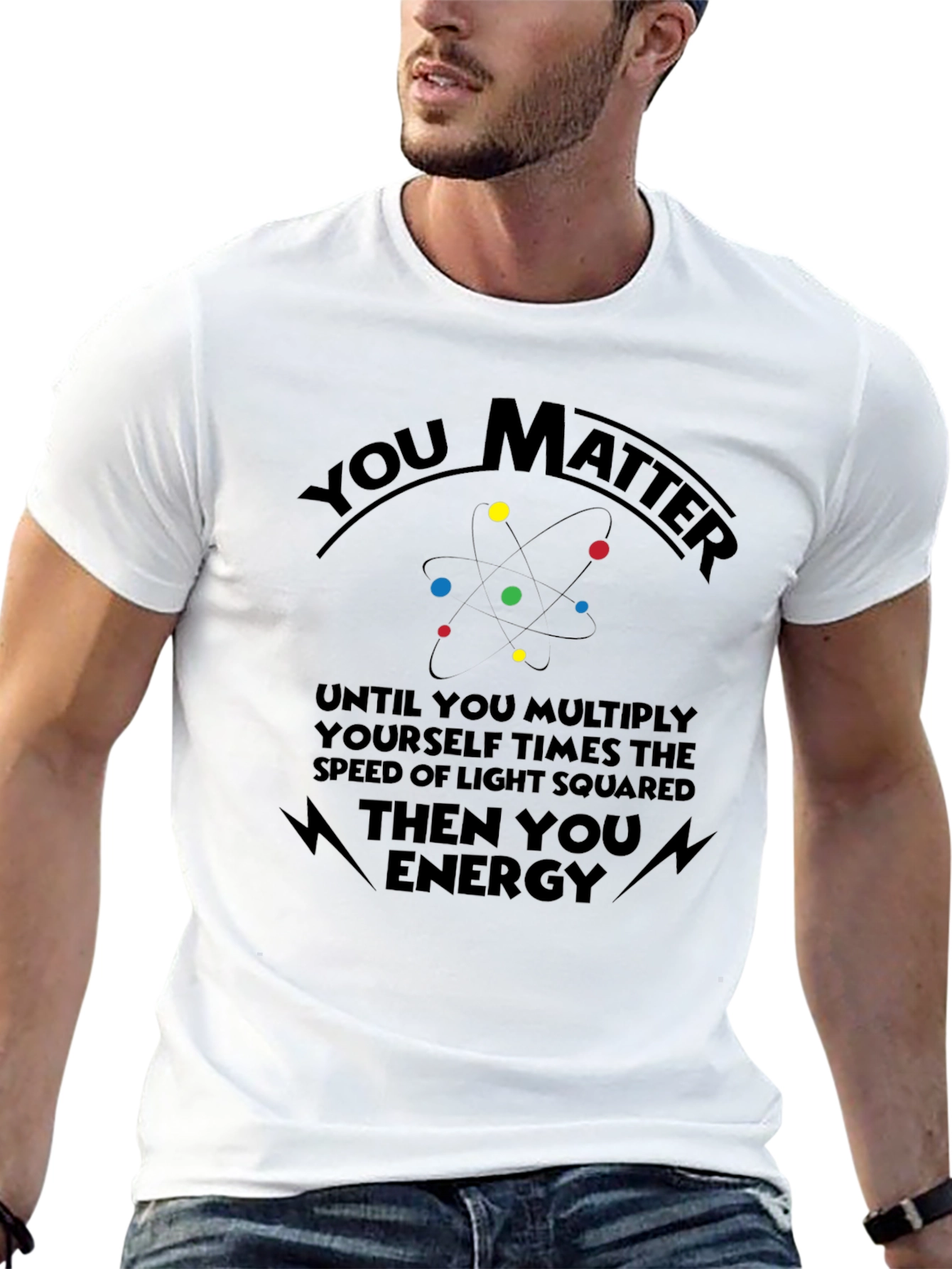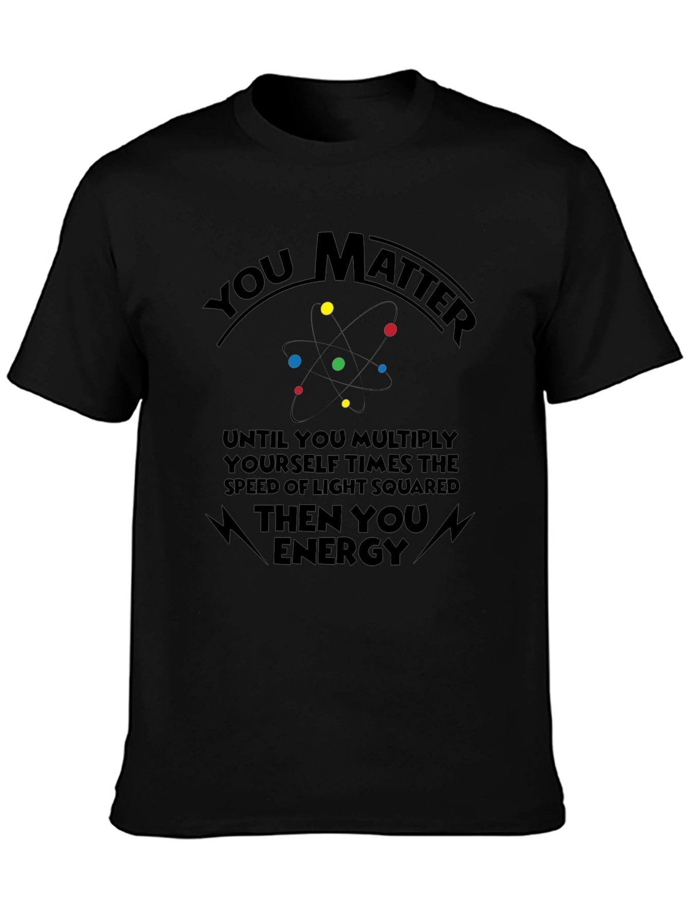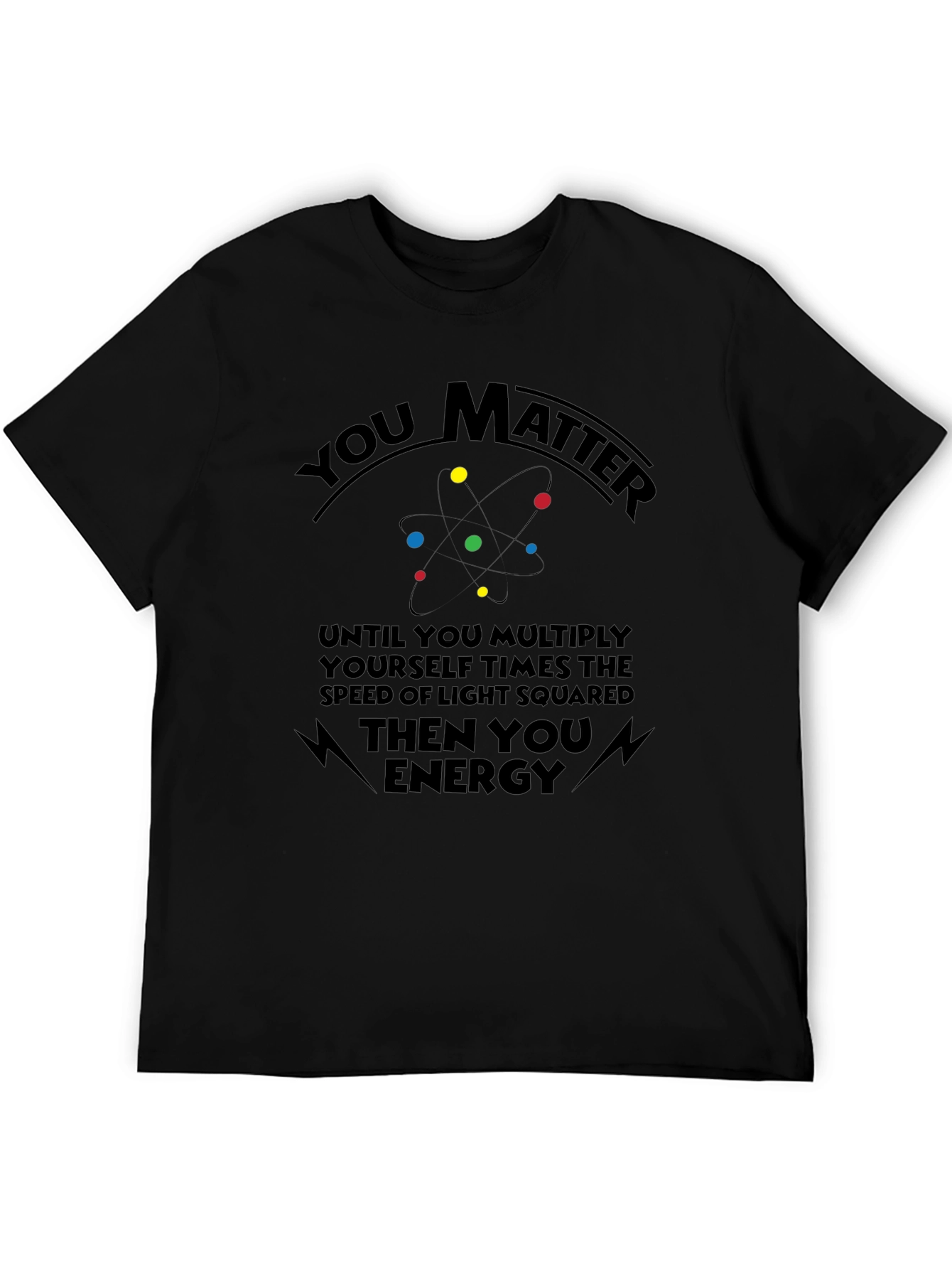 This black t-shirt features a humorous science-themed design. The print includes an atom graphic and the phrase "You Matter, Until you multiply yourself times the speed of light squared, then you energy." This playful design is perfect for science enthusiasts, physics students, or anyone with a nerdy sense of humor. It's a comfortable and eye-catching shirt that is sure to spark conversations. Wear it to school, science conventions, or casual hangouts to show off your love for science and witty wordplay.