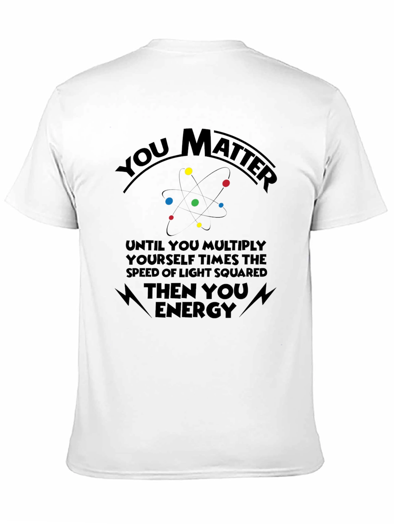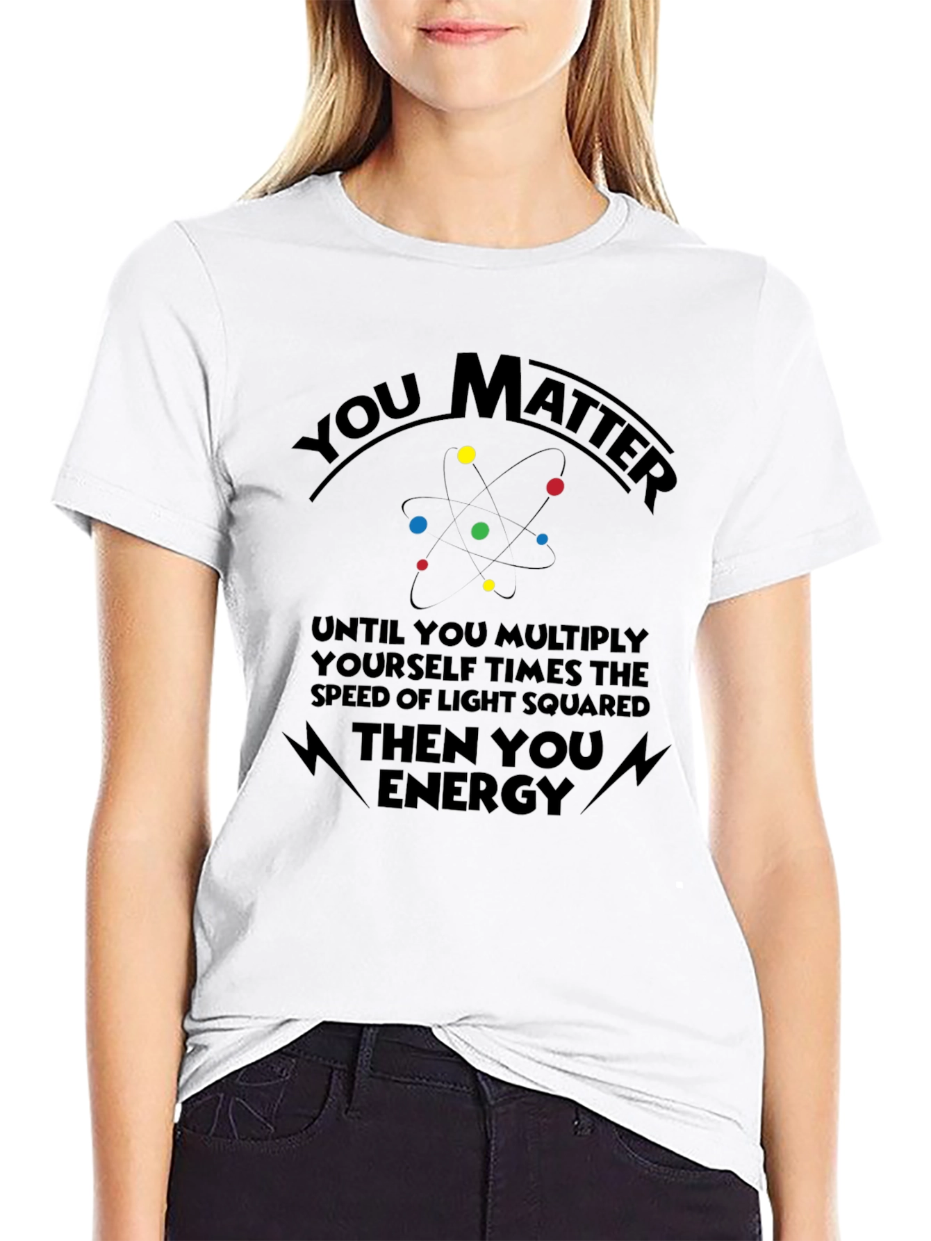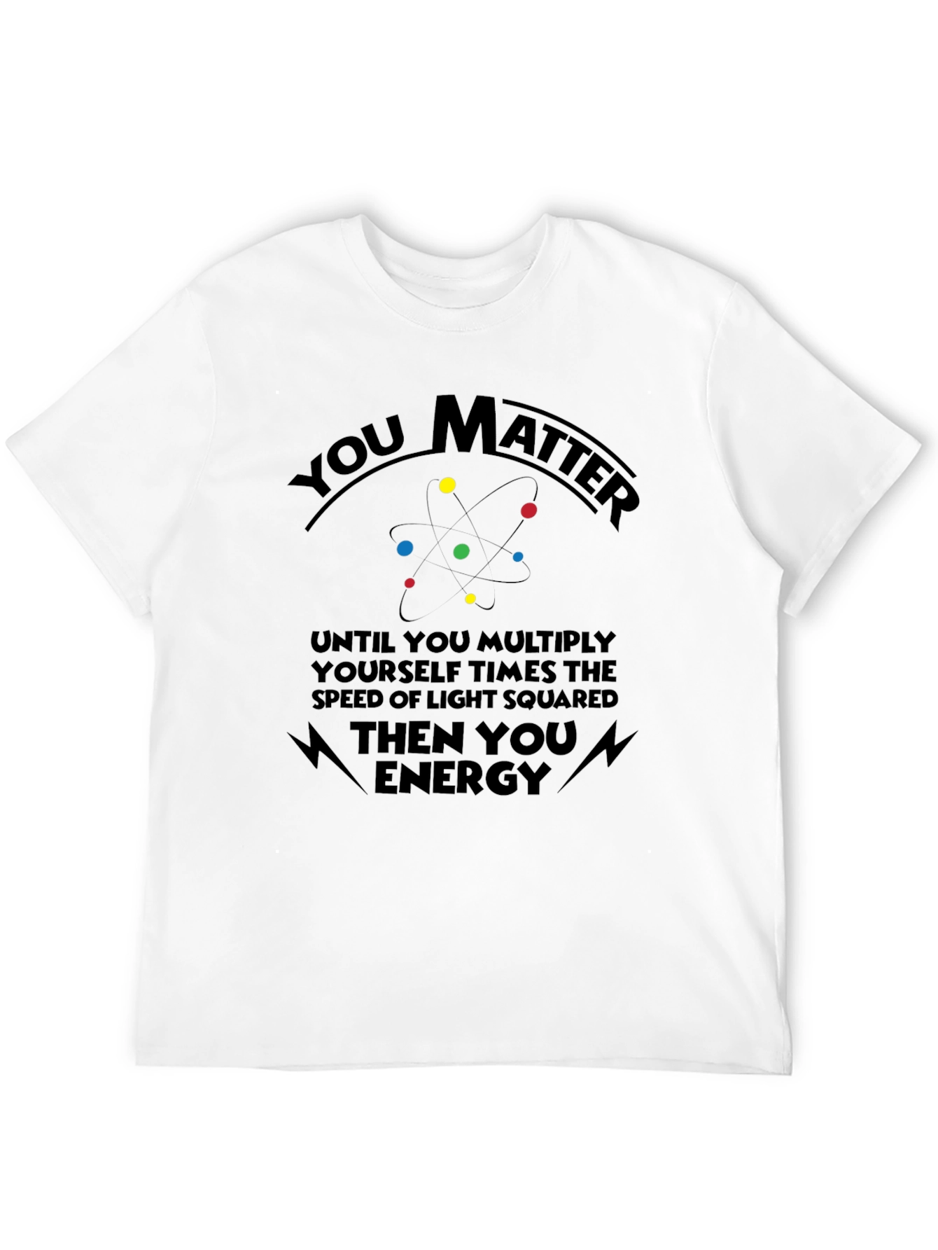 This black t-shirt features a humorous science-themed design. The print includes an atom graphic and the phrase "You Matter, Until you multiply yourself times the speed of light squared, then you energy." This playful design is perfect for science enthusiasts, physics students, or anyone with a nerdy sense of humor. It's a comfortable and eye-catching shirt that is sure to spark conversations. Wear it to school, science conventions, or casual hangouts to show off your love for science and witty wordplay.